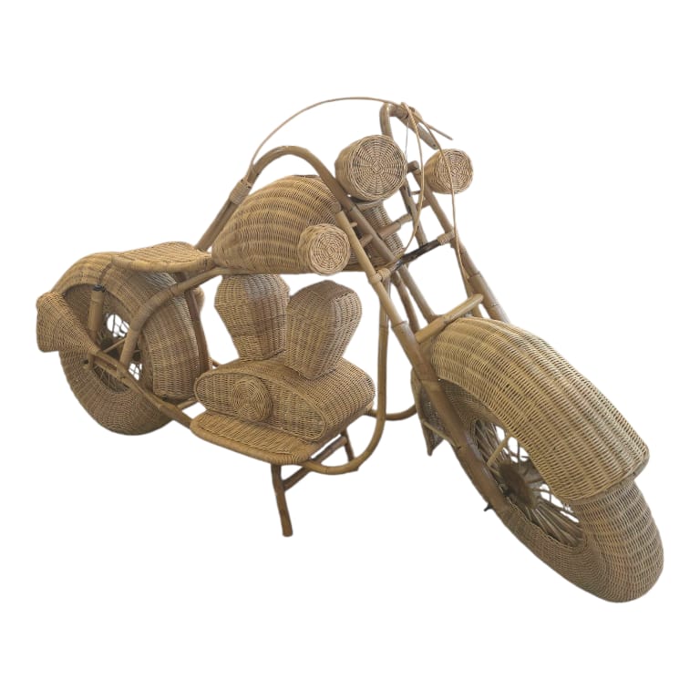 Handwoven from natural rattan, this decorative vintage motorcycle adds whimsy and texture.