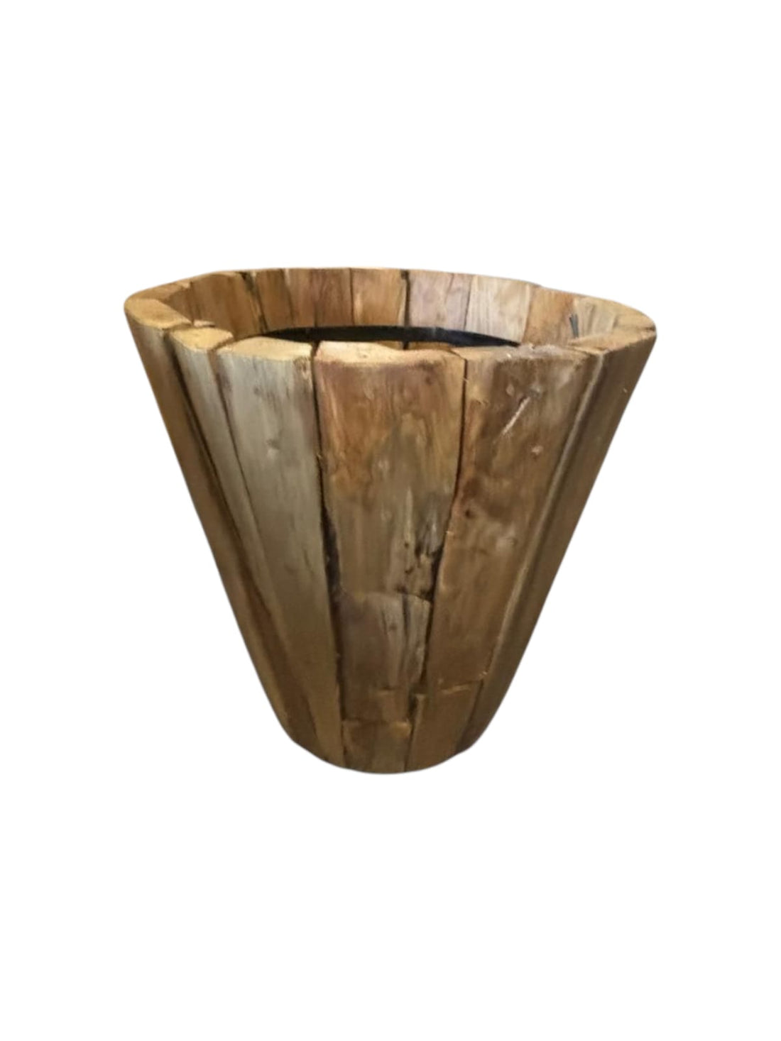 A sculptural teak pot with a circular design and natural grain finish. Perfect for planters...