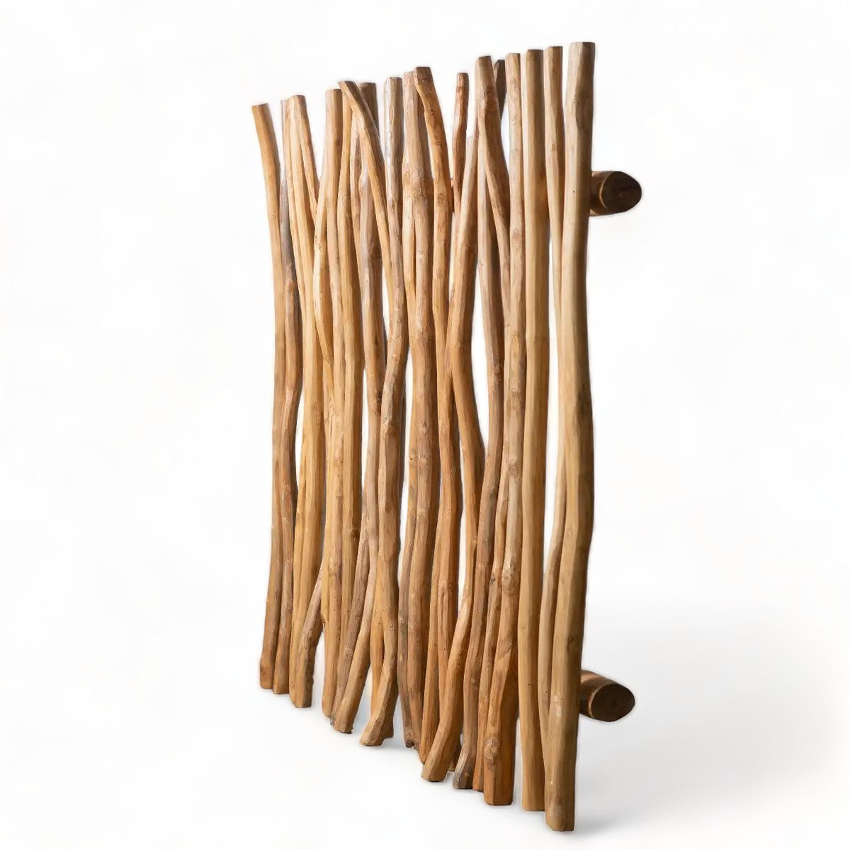 This architectural panel is crafted from reclaimed teak wood, originally used in traditional Indonesian roofs. Featuring a unique natural patina and linear form, it brings rustic character and history to any interior wall, ceiling accent, or display setting.