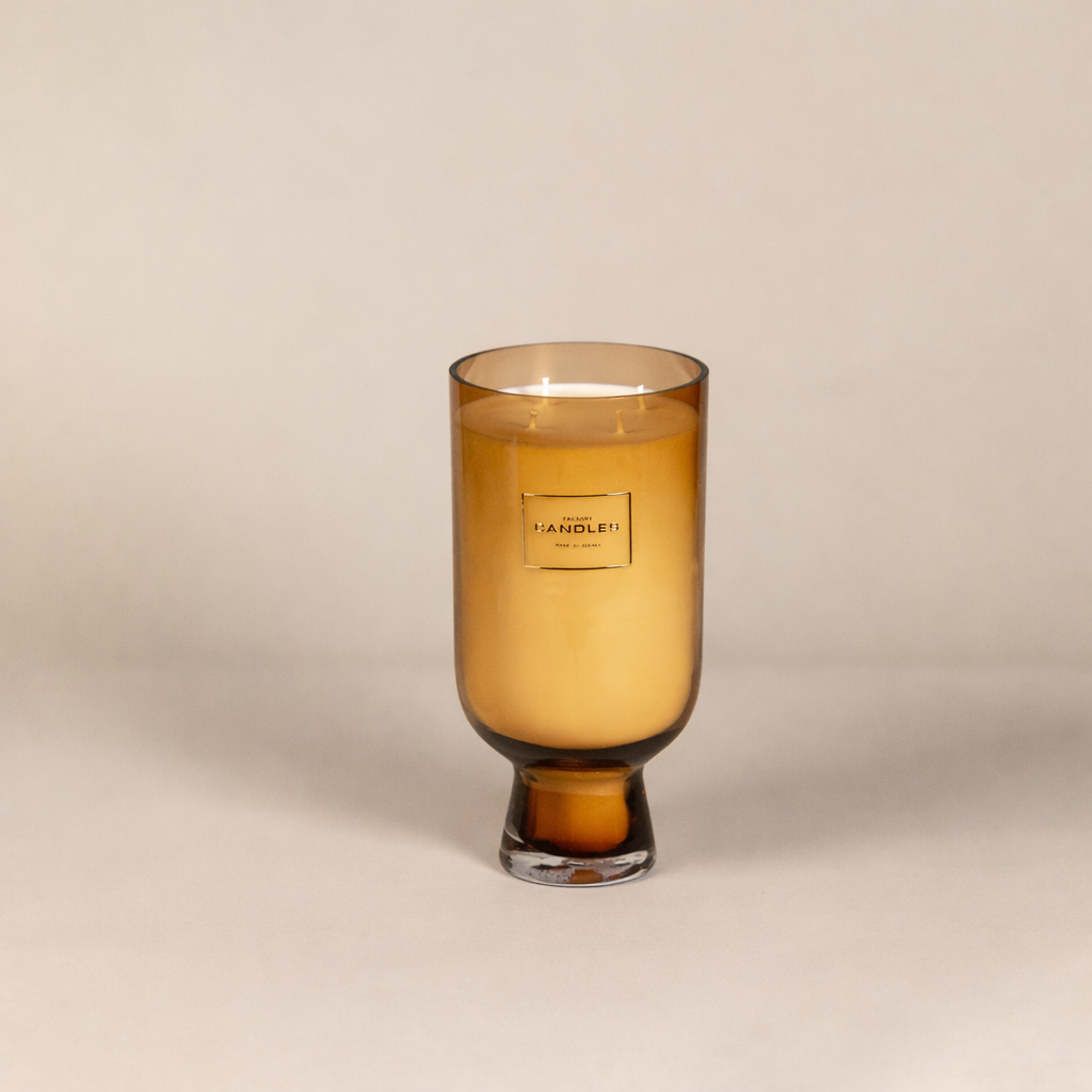 Hand-poured as part of the Cabana Miami & Factory Candles collaboration, the Kiara candle is presented in an elegant amber-gold glass vessel with a sculptural pedestal base. The warm, translucent hue and refined silhouette blend classic glassmaking with a modern sensibility, creating a statement piece that feels both timeless and elevated.