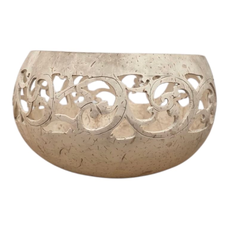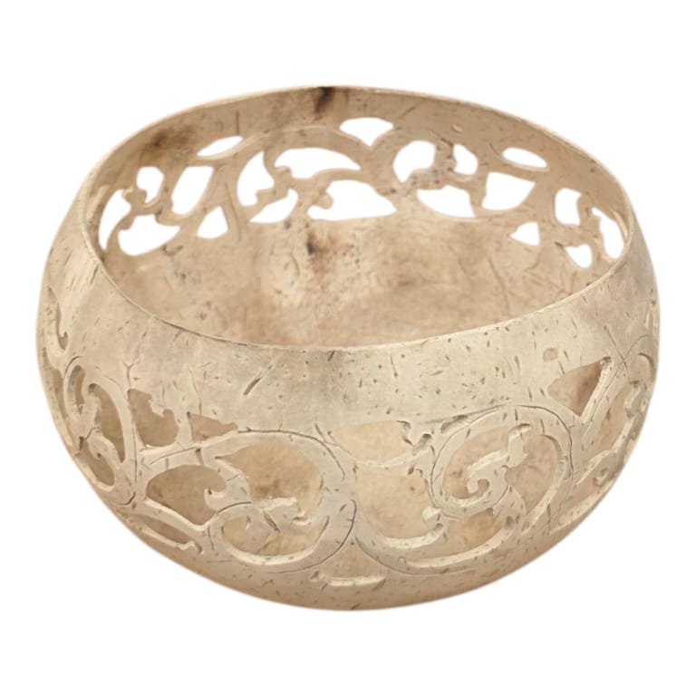 Featuring ornate openwork patterns that mimic natural vines and roots, this coconut shell dish adds a touch of tropical artistry to any space.