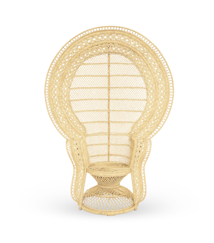 The Peacock Rattan Chair is a statement piece of artistry and grandeur. Handwoven from natural rattan, it features an intricate lattice design and an oversized circular backrest that radiates elegance and power. Its sculptural silhouette and meticulous craftsmanship make it both a functional seat and a decorative masterpiece. Perfect for accenting luxury interiors, event setups, or statement corners, this chair embodies tropical regality — blending bohemian flair with timeless sophistication.