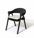 The Noir Rihanna dining chair from the features a sophisticated design with a seat crafted from high-quality teak wood. This stylish chair is not only durable but also boasts a comfortable seat cushion, enhancing the overall dining experience. The combination of teak and a carefully designed cushion reflects a blend of elegance and practicality, making it a standout piece in any dining setting.