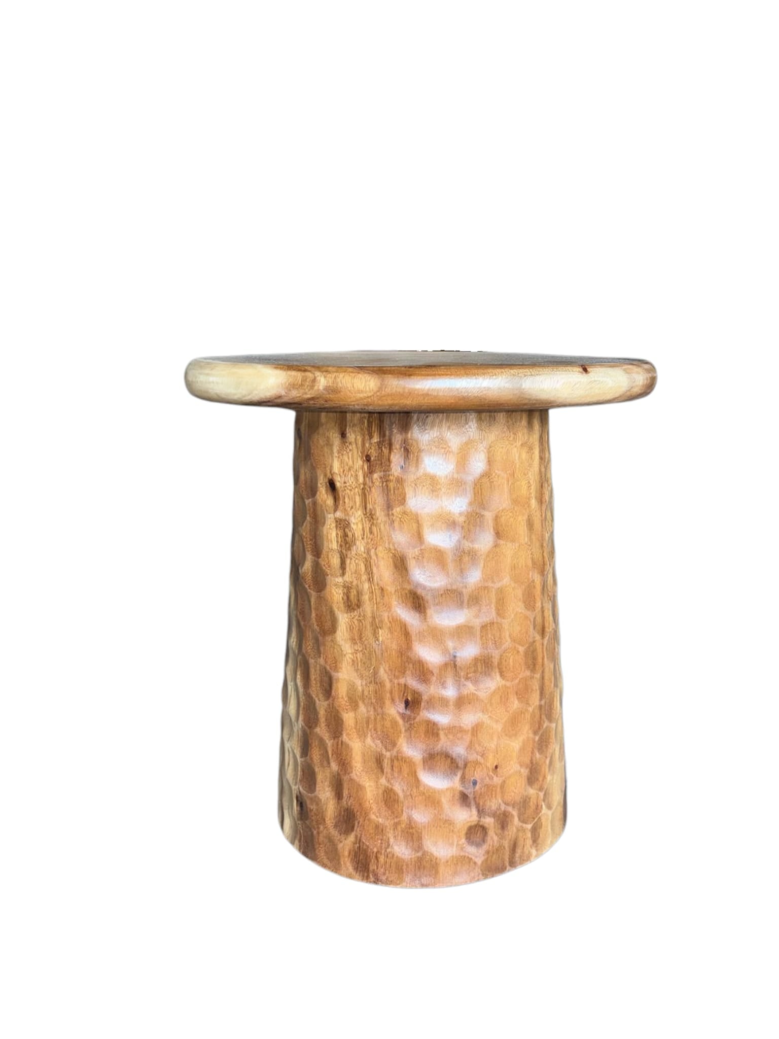 The Okimi Side Table features a carved geometric base and smooth circular top, blending craftsmanship with architectural design. A timeless piece that fits seamlessly into earthy or contemporary interiors.