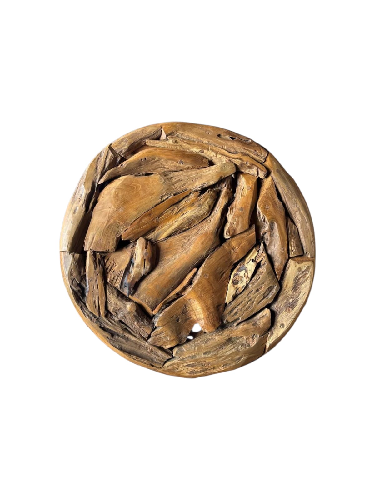 Hand-carved from reclaimed teak, this statement wall piece showcases the natural erosion patterns of the wood — a striking organic accent.