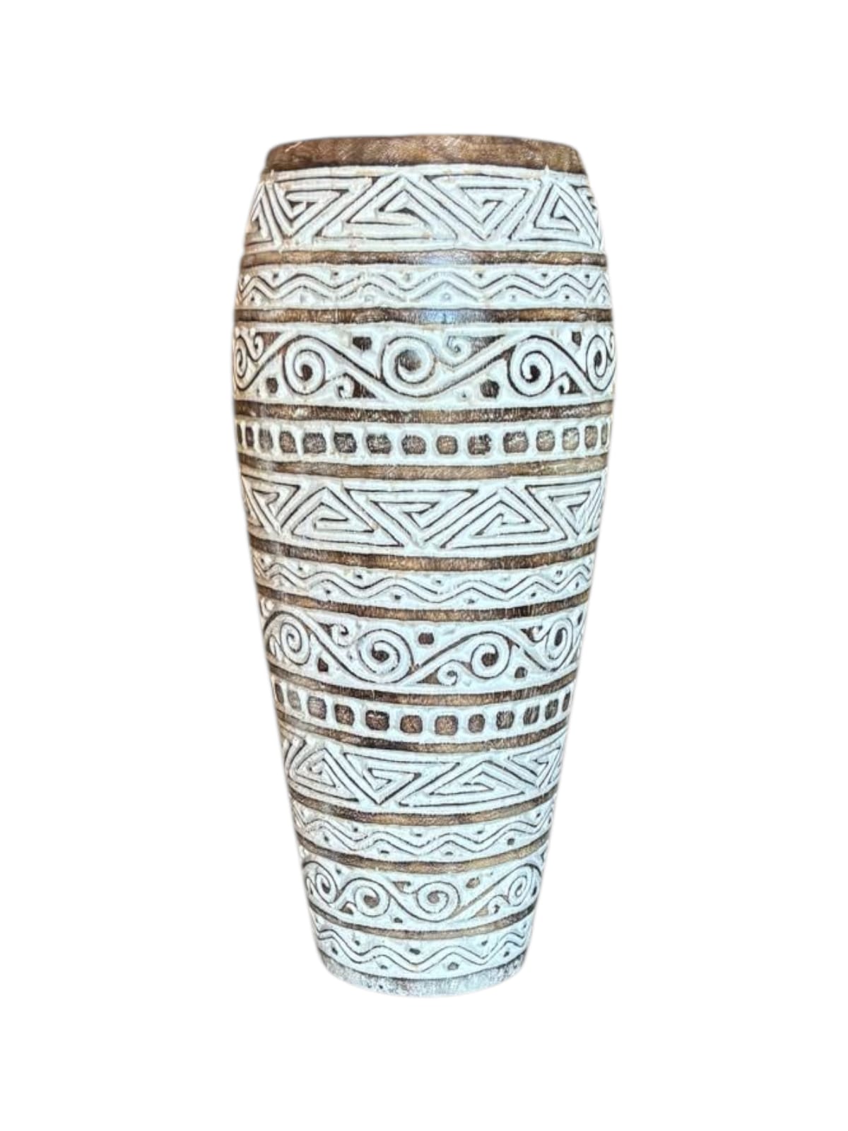A decorative hardwood vase showcasing full-hand carving and detailed craftsmanship. Ideal as a standalone art piece or paired with dried botanicals.